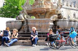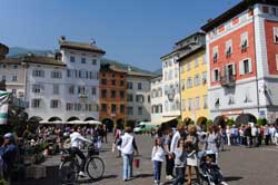 Wir benutzen hier den Radweg weiter bis zur zweiten Etschbrücke, der Ponte San Lorenzo und können hier am Kreisverkehr in die Innenstadt abbiegen. Die Kirche am gegenüberliegenden Ufer ist die Parrocchia di Sant'Apollinare aus dem 14. Jh. Trento sollte auf keinen Fall ausgelassen werden. Aus dem Kreisverkehr radeln wir stadteinwärts auf der Straße Cavalcavia San Lorenzo mit Blick auf den Torre Vanga über die Bahngleise hinweg zur Innenstadt. An der ersten Querstraße, der Via Andrea Pozzo, radeln wir nach rechts geradeaus über die Via Torre Vanga hinweg in die Via delle Orfane und gelangen so rasch an die große Piazza del Duomo. Der große Brunnen Fontana del Nettuno ist ein beliebter Treffpunkt und Mittelpunkt der Piazza. Trento wurde einst von den Kelten gegründet und hieß Trent.